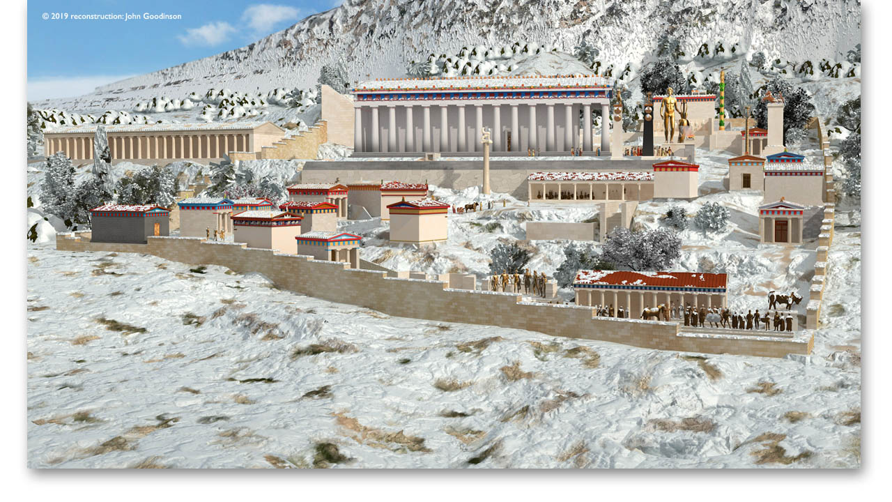 Delphi was built over an extended period - over 1000 years. We start our reconstruction in the 6th century with the first temple on a raised platform. We expand into the 4th - then 2nd centuries to show how the additional treasuries, dedications and architecture impacted on the existing sanctuary. Also the changing seasons (below: 4th century BCE, winter).