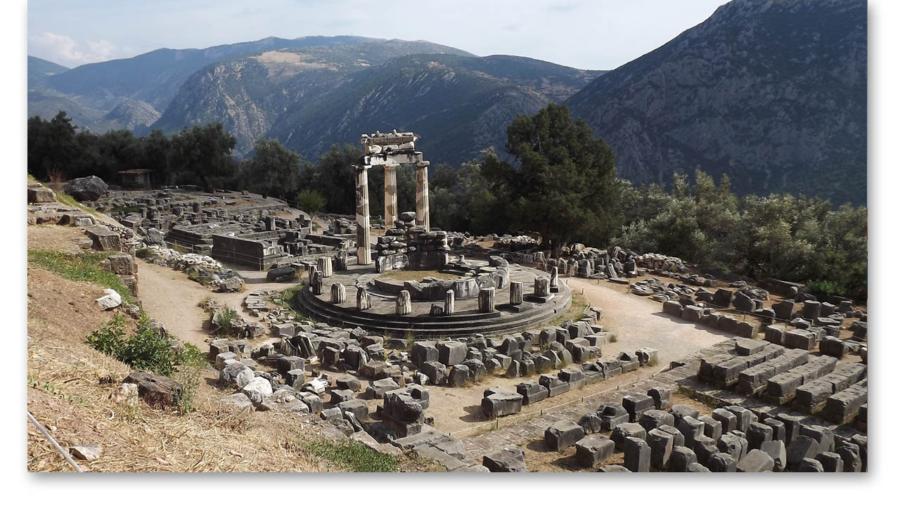 Today, however, as we contemplate the calm spaciousness in the shade of the Phaedriades (peaks of Parnassos range), waiting for the sun to rise above them, the green and blue horizons blend. Barely can we make out the silhouette of Apollo, accompanied by a bunch of Cretans, ascending towards the place where, through the allegory of his prophecies, he would teach people the value of thinking, the assets of philosophy. He would instruct them to whet their spirit, to live in harmony, to study arts and music, and always to ensure that the law and order prevail over anarchy and chaos.